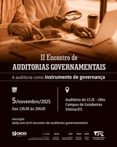 Em mais uma parceria da Auditoria Interna (Audin) com o Departamento de Ciências Contábeis, no dia 05 de novembro de 2025, das 14h às 20h20, o Auditório Manoel Vereza de Oliveira no CCJE – UFES, em Vitória/ES, será o palco para o II Encontro de Auditorias Governamentais: A auditoria como instrumento de governança, que reunirá especialistas e autoridades para discutir práticas, normas e tendências que estão moldando o futuro da auditoria no setor público para a construção de uma gestão pública mais forte e transparente.
