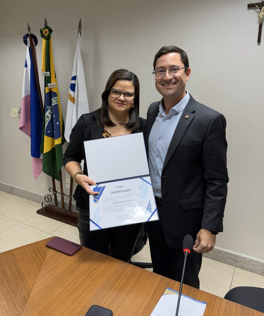 Em um momento de emoção e gratidão, a conselheira e contadora Paula Antonela agradeceu pela oportunidade de integrar o Conselho e ressaltou que, embora não possa mais se dedicar à função de conselheira, seguirá honrando a profissão contábil em sua atuação profissional e na sociedade. Ela destacou ainda o papel essencial dos colaboradores do CRCES: “Os mandatos passam, os conselheiros passam, mas os funcionários permanecem. São eles que fazem o Conselho acontecer”, afirmou, estendendo também uma homenagem especial às mulheres que atuam na área contábil.